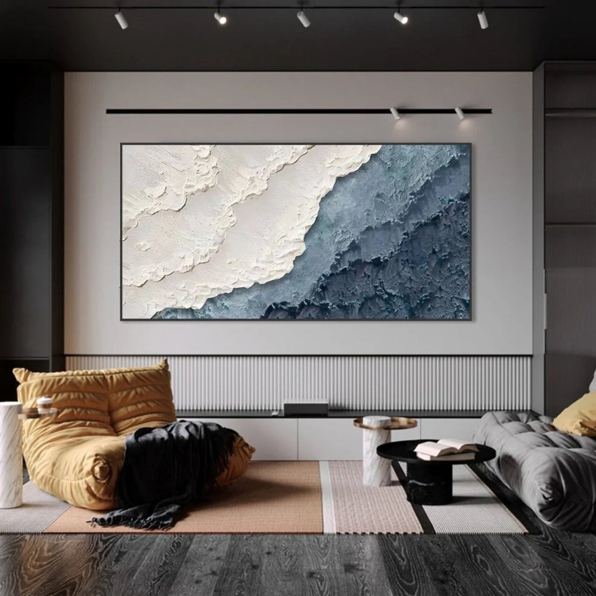 - Hand-painted abstract seascape with textured plaster and oil layers