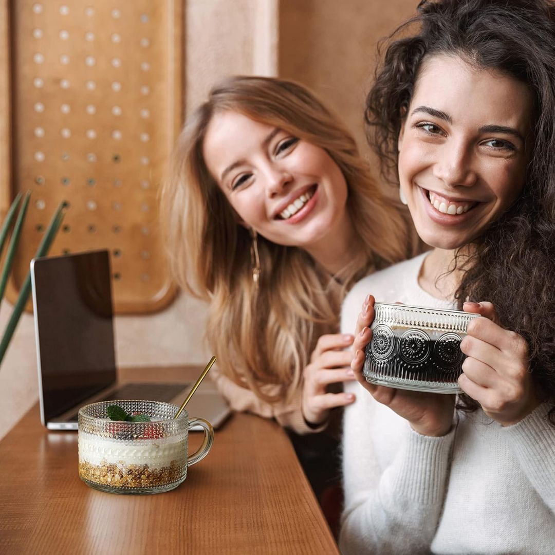 Add a touch of timeless elegance to your daily routine with this 4-piece vintage glass mug set. Crafted from thick, durable glass, each 14 oz (415 ml) mug features delicate embossed sunflower and raindrop patterns that reflect beautifully in the light. The set includes rose-gold spoons and natural bamboo lids, blending functionality with nostalgic charm. Whether you’re savoring coffee, tea, or smoothies, these mugs elevate every moment with vintage warmth and style.