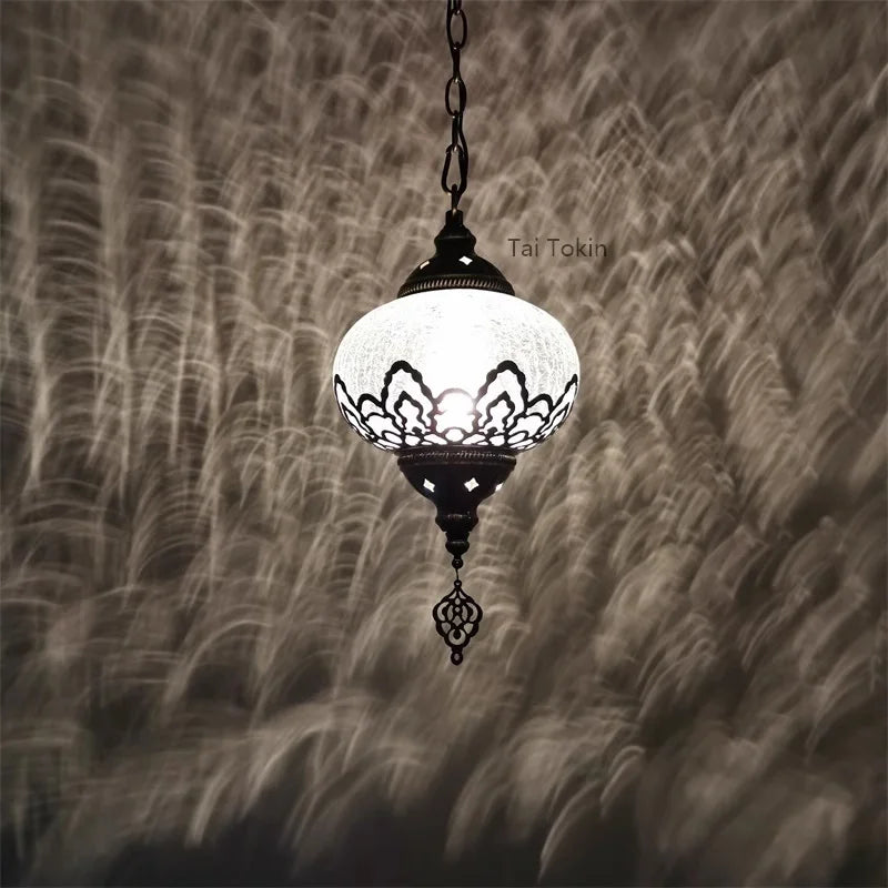The hollow ice crack pendant light combines hand-carved artistry with glass craftsmanship, bringing a warm and distinctive glow to any space. Its ice-cracked glass shade measures 7 inches in diameter, suspended from a 39-inch adjustable chain that adapts to your ceiling height. Finished in painted bronze over iron, this pendant is both durable and refined, making it ideal for homes and commercial spaces alike. Perfect for living rooms, bedrooms, dining areas, or stylish cafes and restaurants, it casts a welcoming light with timeless charm.
